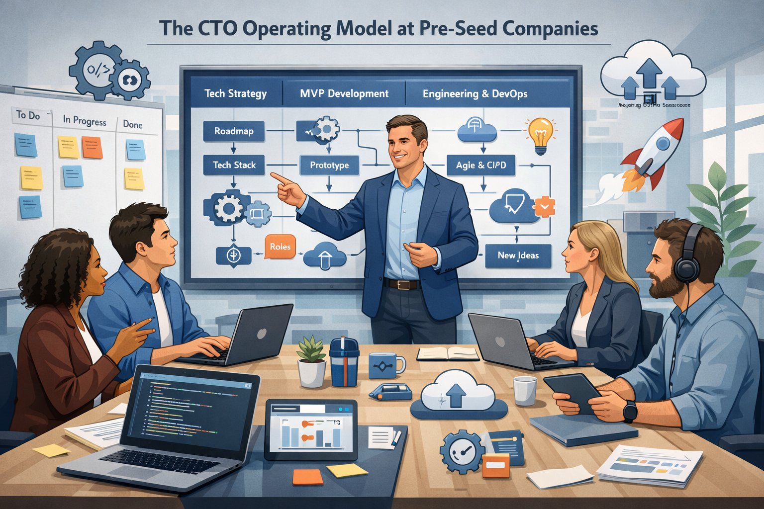 Speed beats elegance at pre-seed. The CTO’s job: ship a testable product in 6-12 weeks, not 6 months.